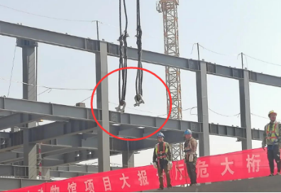 近日保定的中國古動物館正在建設中,目前正在進行大報告廳的桁架吊裝作業。此次吊裝的桁架結構,為本項目跨度最大、重量最重的構件區域,其總體跨度將達到30m,最大桁架重量接近50噸,屬于本項目列入危險性較大分部分項工程的范圍。吊裝時工人使用了鋼絲繩來吊裝桁架,為了保證吊裝的安全在連接處使用了卸扣來連接。